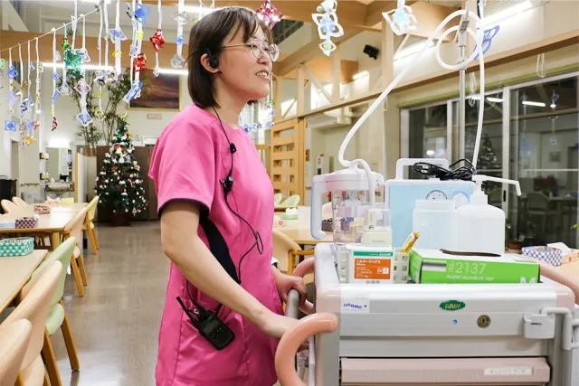 トランシーバーを活用することで、玄関や浴室などどこにいても職員同士がすぐに声を掛け合えるようになり、必要な情報をその場でリアルタイムに共有できるようになりました。入浴や移動の援助など、さまざまな場面でタイミングよく支援が行えるようになり、ご利用者の皆さまにとっても、より安心して過ごせる環境づくりにつながっています。